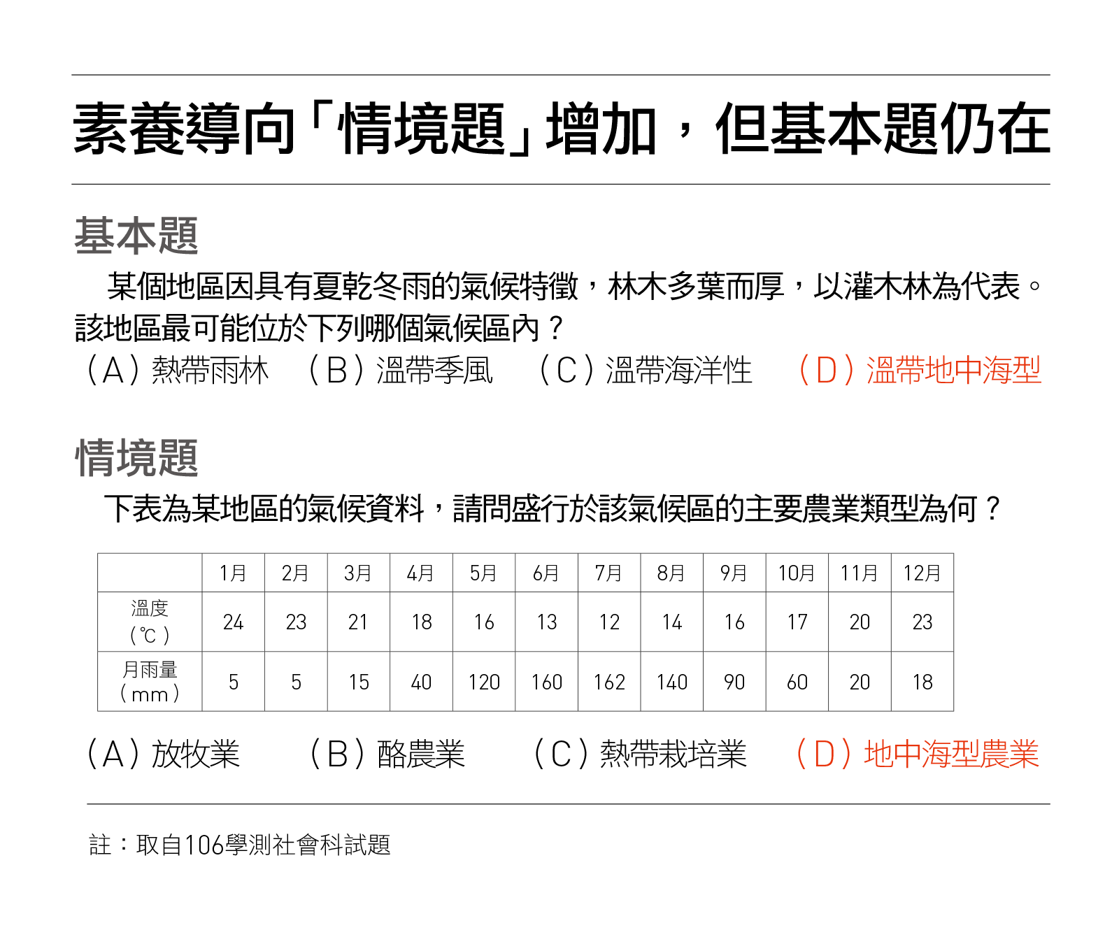 情境題,則是給予學生一份表格,提供各月份的溫度、雨量,學生須從這樣的圖表中推論出這是地中海型氣候,同樣需要知識,但得多一層思考,「所以題目不一定很長,也不一定很難,能靈活應用是重點。」(題型比較看這裡)