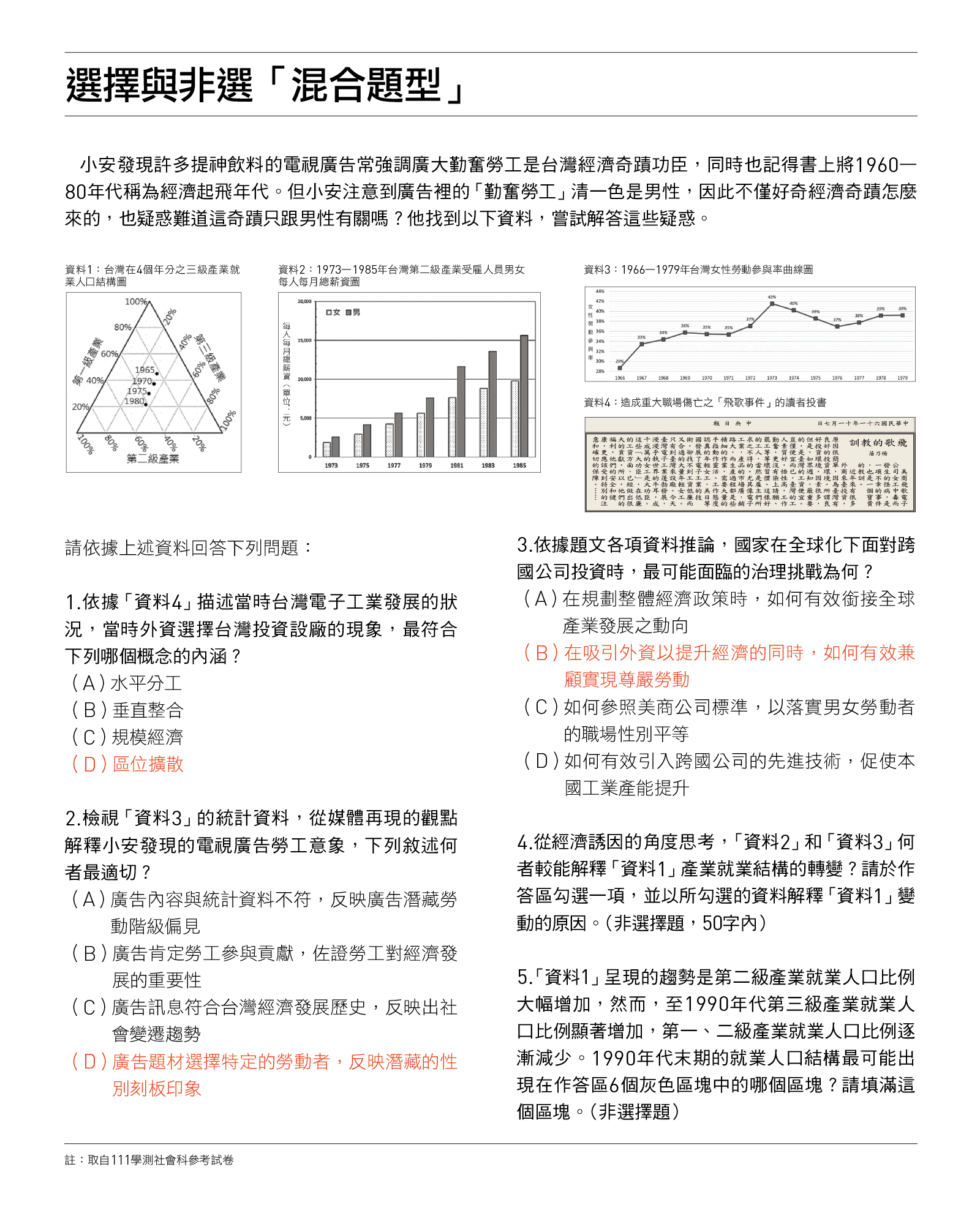 111大考上路的,還有「混合題型」,將選擇題與非選題放在同一個題組。周兆民表示,這樣的命題初衷就是希望題目能更多元、活潑,整個題組原則上會由淺入深,一步步引導學生思考作答。